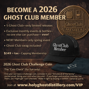 Elevate your spirits experience with a membership like no other – the Executive GhostClub Membership. The Holy Ghost Distillery GhostClub is a membership that is focused on you. Providing unique, private GhostClub only events and experiences here at our distillery. Founding executive members receive five (5) very limited-edition spirits details and dates to follow but there will be a 6 exclusive events – 4 pick-up events & one pick-up / charity event.